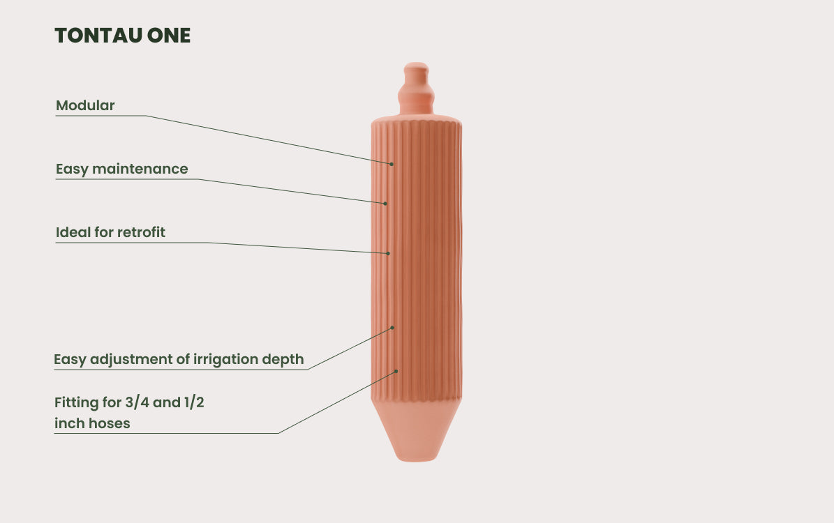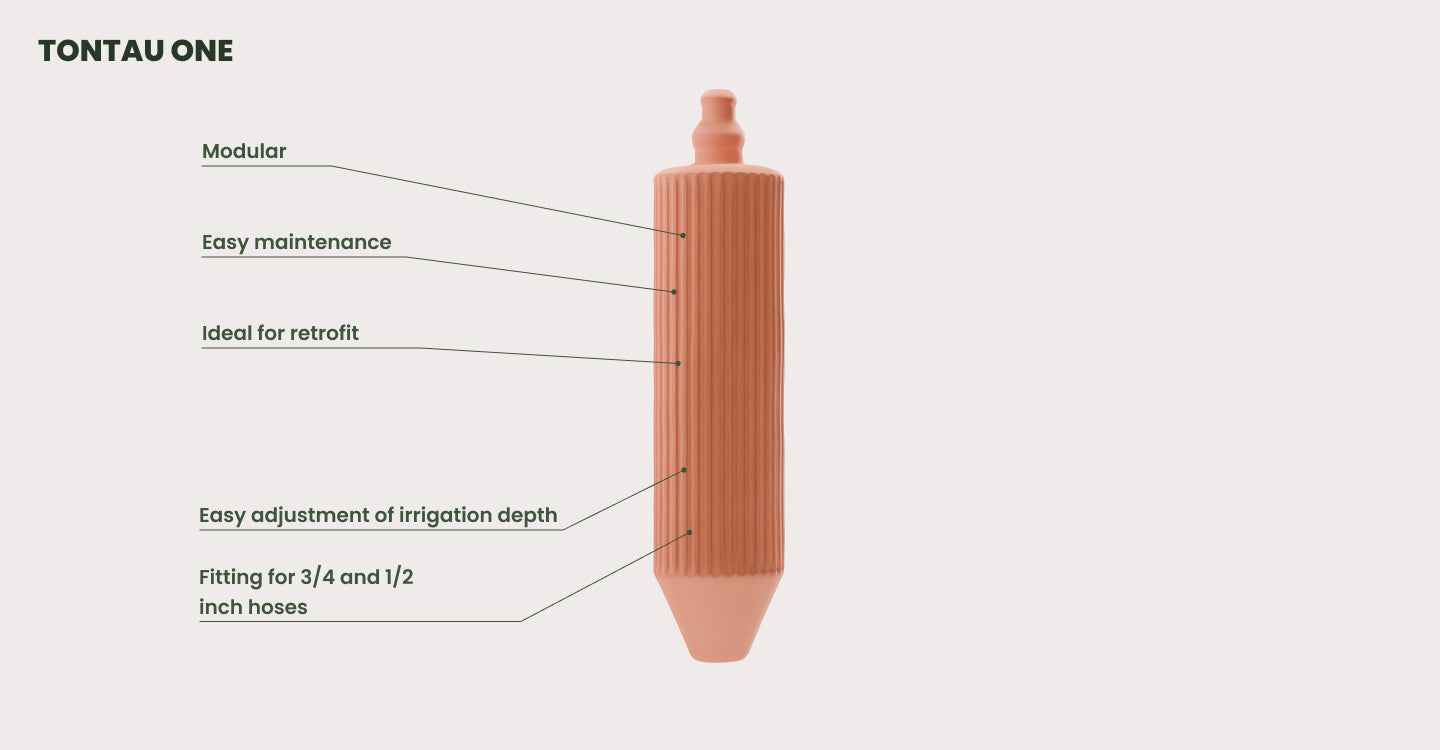 Adjustable depth: You can use tontau ONE at any depth, depending on the desired irrigation depth. To do this, you just have to cut a piece of hose to length accordingly.