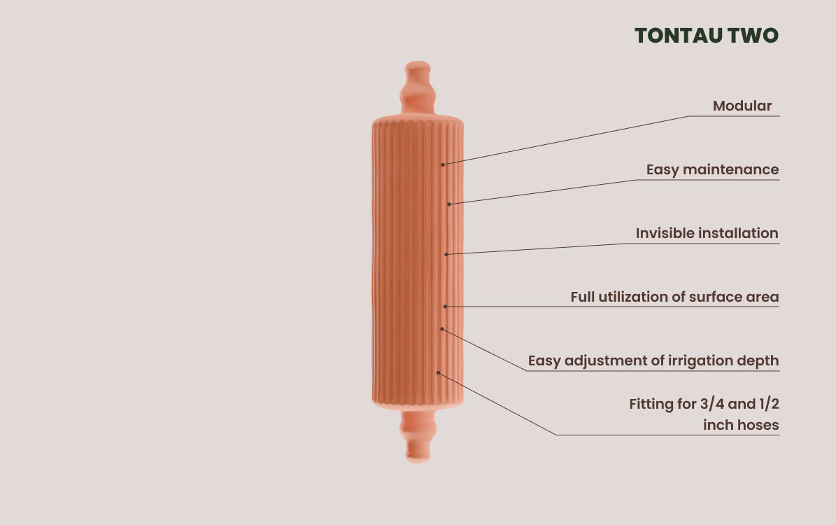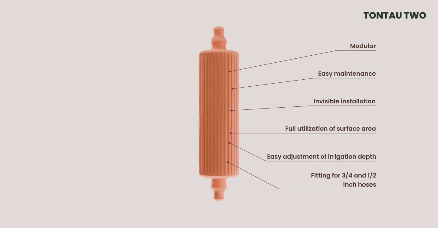tontau TWO is the perfect choice if you're planning an underground irrigation system for your garden beds. Designed to be invisibly installed in trenches, it ensures a consistent water supply directly to your plants' roots. Connect multiple tontau TWO elements and complete the system with tontau ONE as an end piece.