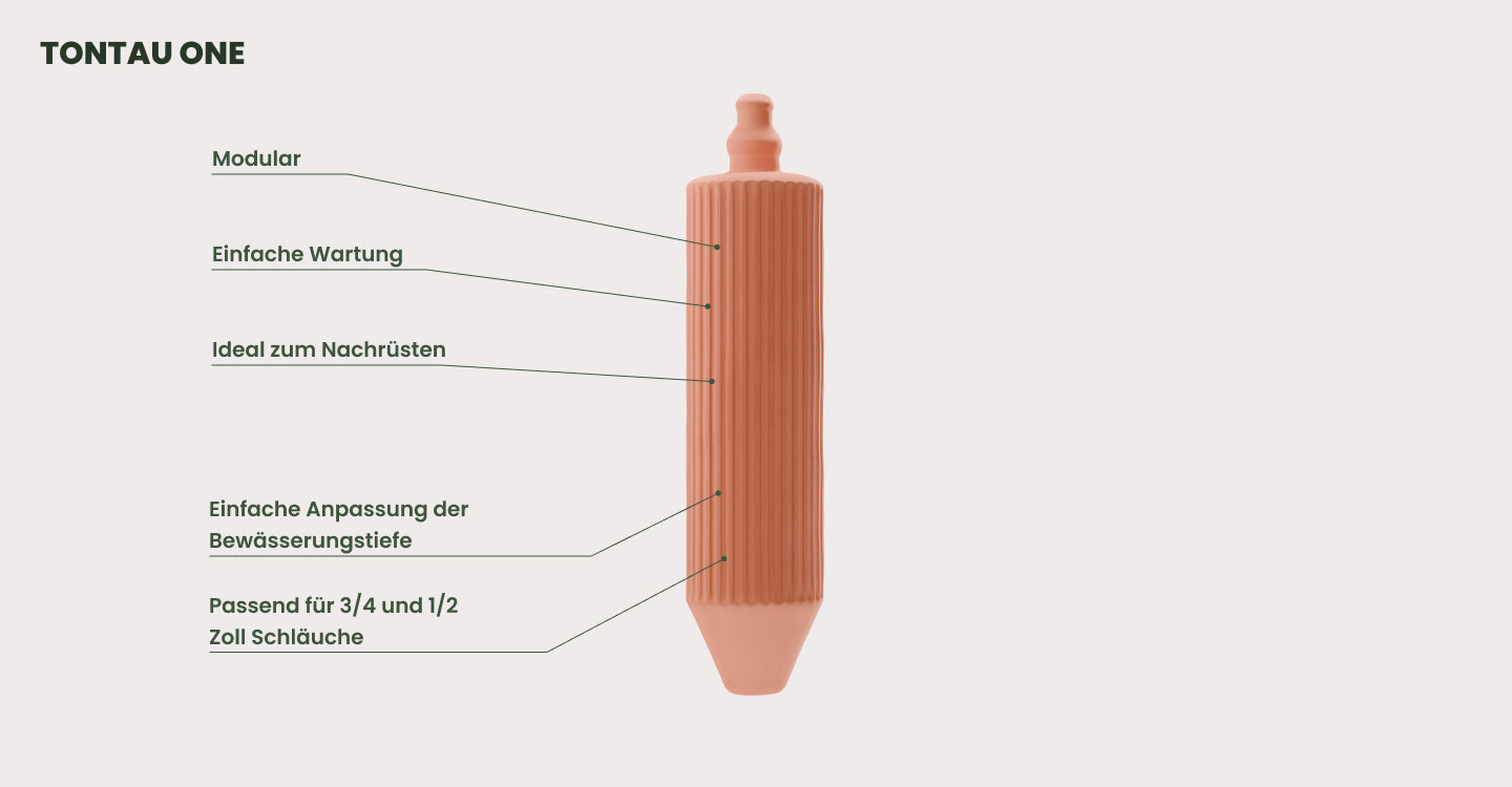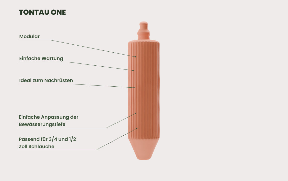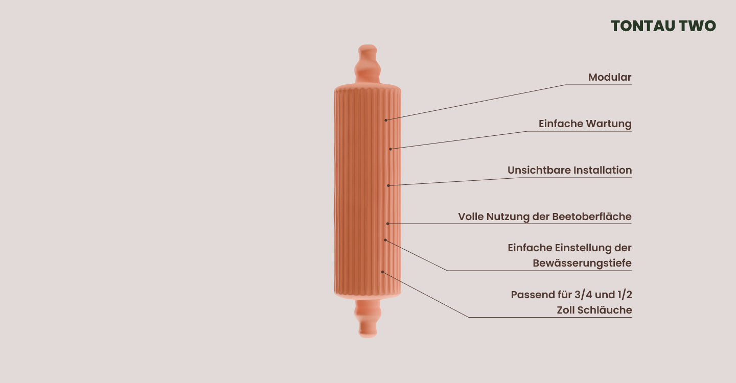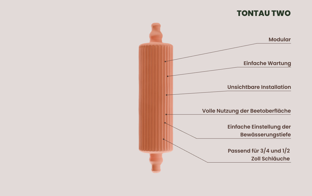 Tontau ONE ist die ideale Wahl für alle, die ihre bestehenden Beete nachhaltig nachrüsten möchten. Mit einer Länge von ca. 210 mm und einem Durchmesser von 50 mm lässt sich tontau ONE ganz einfach in Ihrem Beet installieren, indem du ein Loch gräbst und tontau ONE darin einschlämmst. Dank seines modularen Aufbaus kannst du es einzeln verwenden oder mit anderen tontau ONE und tontau TWO Elementen kombinieren. Die im 10er-Pack enthaltenen T-Stücke ermöglichen außerdem eine mühelose Reihenschaltung. Du kannst die T-Stücke auch als Zubehör bestellen.